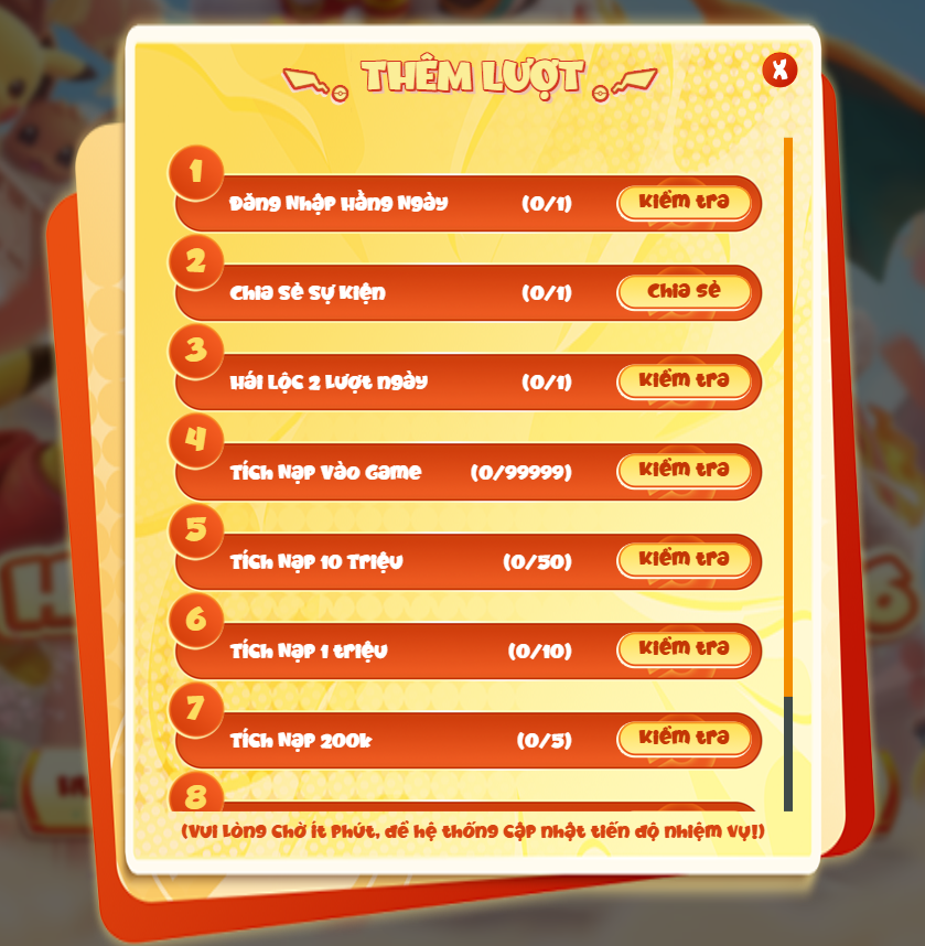 Các Nhiệm Vụ Mỗi Ngày sẽ được làm mới vào lúc 0h00 mỗi ngày trong thời gian diễn ra sự kiện! (Từ 0h00 ngày 10/02/2026 đến 23h59 Ngày 23/02/2026) (Đối với nhiệm vụ tích lũy nạp, HLV cần chờ 5~15' để hệ thống cập nhật tích lũy nạp) |