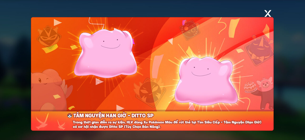 - Trong thời gian diễn ra sự kiện, HLV dùng Xu Pokémon Màu để rút thẻ tại Tìm Siêu Cấp - Tâm Nguyện (Hạn Giờ) có cơ hội nhận được Ditto SP (Tùy Chọn Bản Năng)