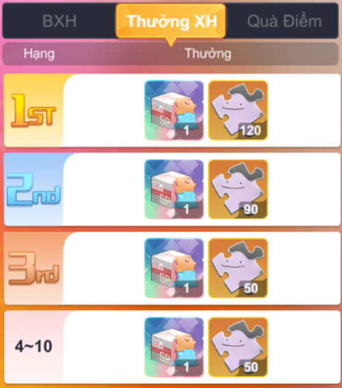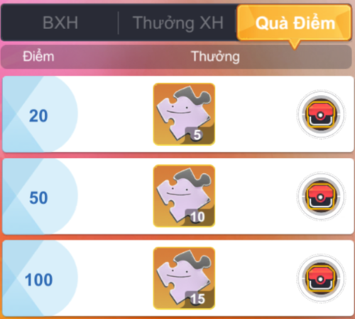 - Các QUÀ giá trị mà HLV có thể nhận được như: Quà Rút Thẻ Lớn, Quà CD Writer Lớn, Quà Mảnh SSR Lớn, Quà Sách Huấn Luyện Lớn, Quà Ditto Lớn, Quà Poké Ball Lớn, Quà Tinh Hoa Vật Liệu Lớn, Quà Phiến Đá-III, Quà Thủy Tinh Z Lớn