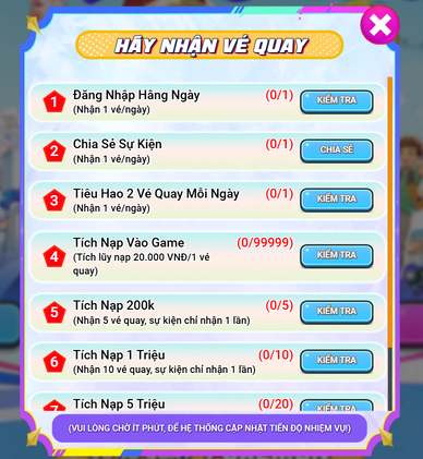 HLV hoàn thành các nhiệm vụ để nhận Vé Quay để tham gia Vòng Quay Pokémon, các nhiệm vụ bao gồm: