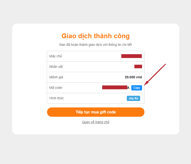 - Bước 3: Sau khi thanh toán thành công, hệ thống sẽ hiển thị Mã code.