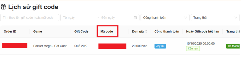 *HLV bấm vào Lịch sử Giftcode để xem lại đơn hàng mua gói Giftcode và Mã Giftcode đã nhận.